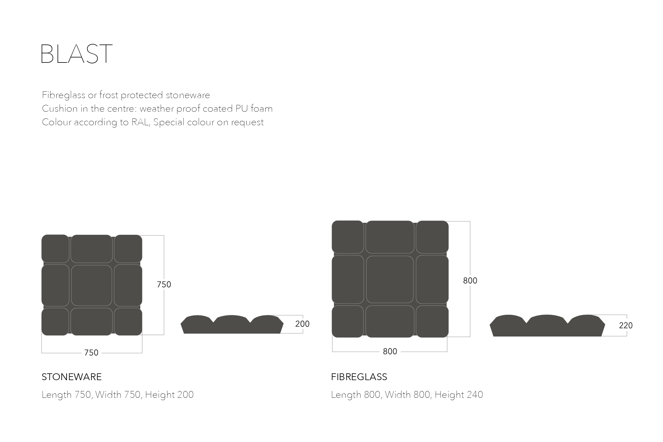Blast is manufactured in any RAL colour on request. It isalso available in frost-resistant, high-quality glazed stoneware ceramic
