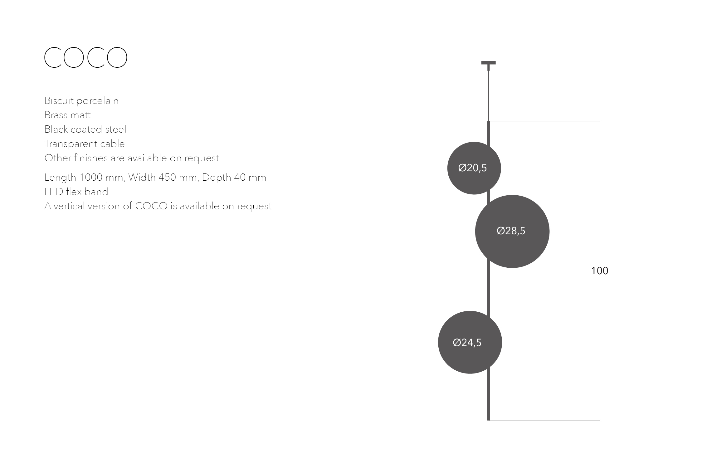 This is our luminaire COCO – designed in reference to the aesthetics of the 1920s. Translucent porcelain discs are aligned in moons of matt golden brass on a black line. COCO can be hung as a single atmospheric light object or grouped together to run the length of a staircase eye.