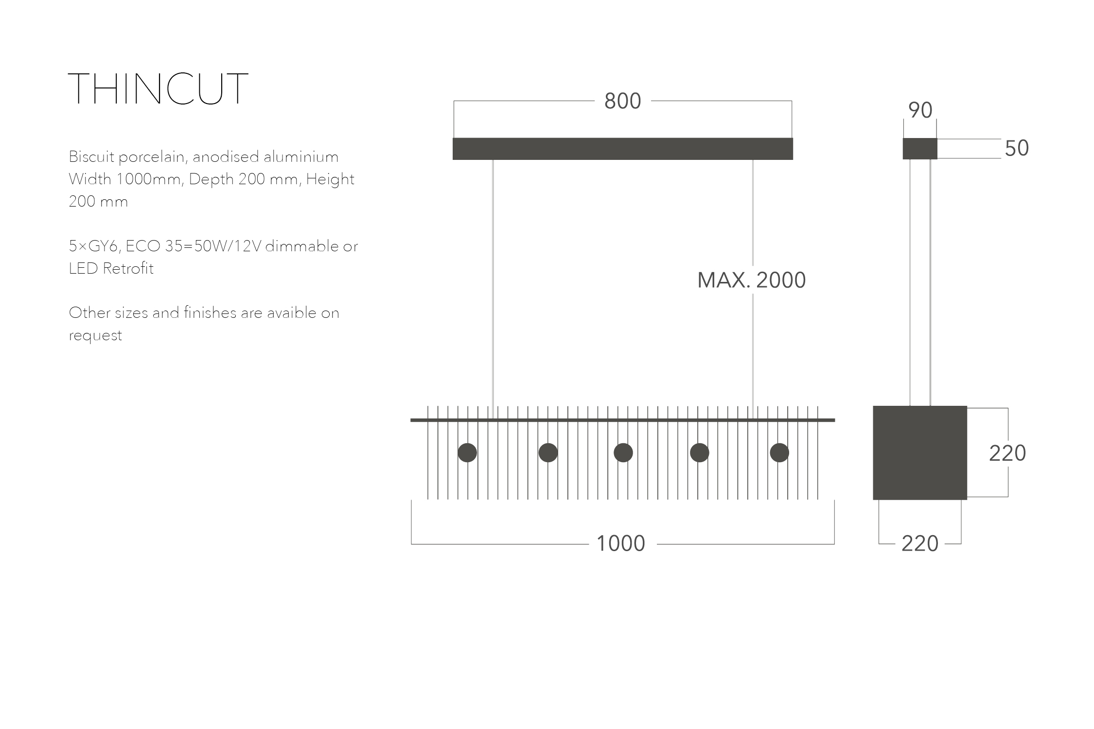 The pendant THINCUT consists of forty thin, hand-moulded porcelain panels that float still in the air like untouched folios. Light falls rhythmically through the lamellar gaps, gently colouring the translucent porcelain sheets in repeating shades. When unlit, the porcelain is snow-white again. The standard length of the luminaire is 100 cm, other lengths and sizes are available on request.